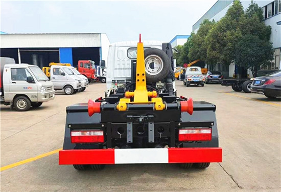 厢体材质为优质碳钢,一车可配多个垃圾箱,厢体厚度(单位:mm):边3底4,厢体容积:5-7立方,厢体两侧和后部为可开式垃圾口设计,方便垃圾的收集和倾倒。翻转架与活动拉臂垃圾车动作设计合理可靠,实现拉箱、锁紧、放箱和自卸操作简单方便。厢体放置在副车架时,通过锁紧架的锁紧,使整车在行驶过程中箱体牢固稳定,同时在自卸过程中使箱体与活动拉臂及翻转架连成一体,形成自卸角;当在放置或拉起拉臂垃圾车箱体时,锁紧架的收回动作使得翻转架与附车架连为一体,便于活动拉臂的放箱或拉箱;该机构的动作使得整车工作准确可靠。 可手动,电控双操作系统,使用方便简单,通过液压缸完成上厢,下厢,锁紧,自卸等作业,实现一车配多厢的循环运转。